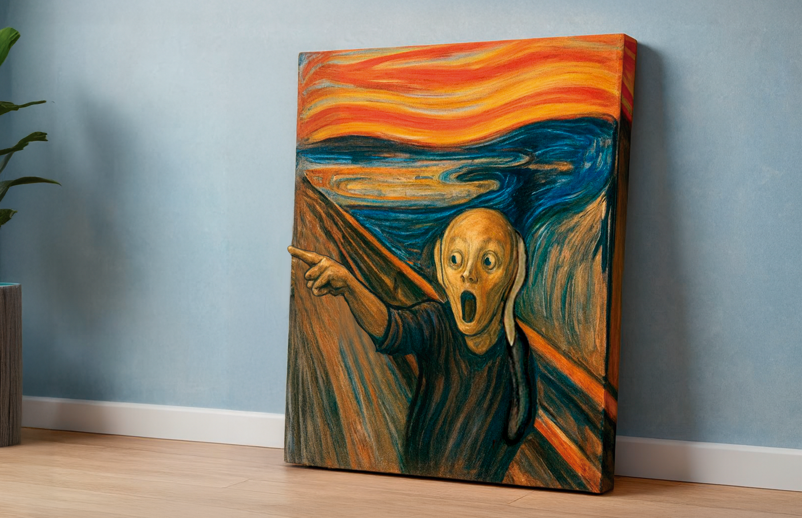 El contraste entre los tonos cálidos del cielo y los azules profundos del fondo genera una atmósfera envolvente que convierte esta obra en el punto focal ideal para salas, estudios creativos, oficinas modernas o espacios artísticos. Cada detalle conserva la esencia expresionista, logrando una presencia poderosa y atemporal.