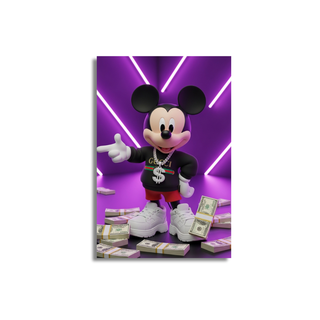 “Mickey Gucci” combina el encanto clásico con el lujo moderno. El ratón más famoso del mundo posa entre fajos de billetes, vistiendo sudadera Gucci y cadena de diamantes. Un diseño con energía, moda y nostalgia que convierte cualquier espacio en una galería de estilo. ✨💰