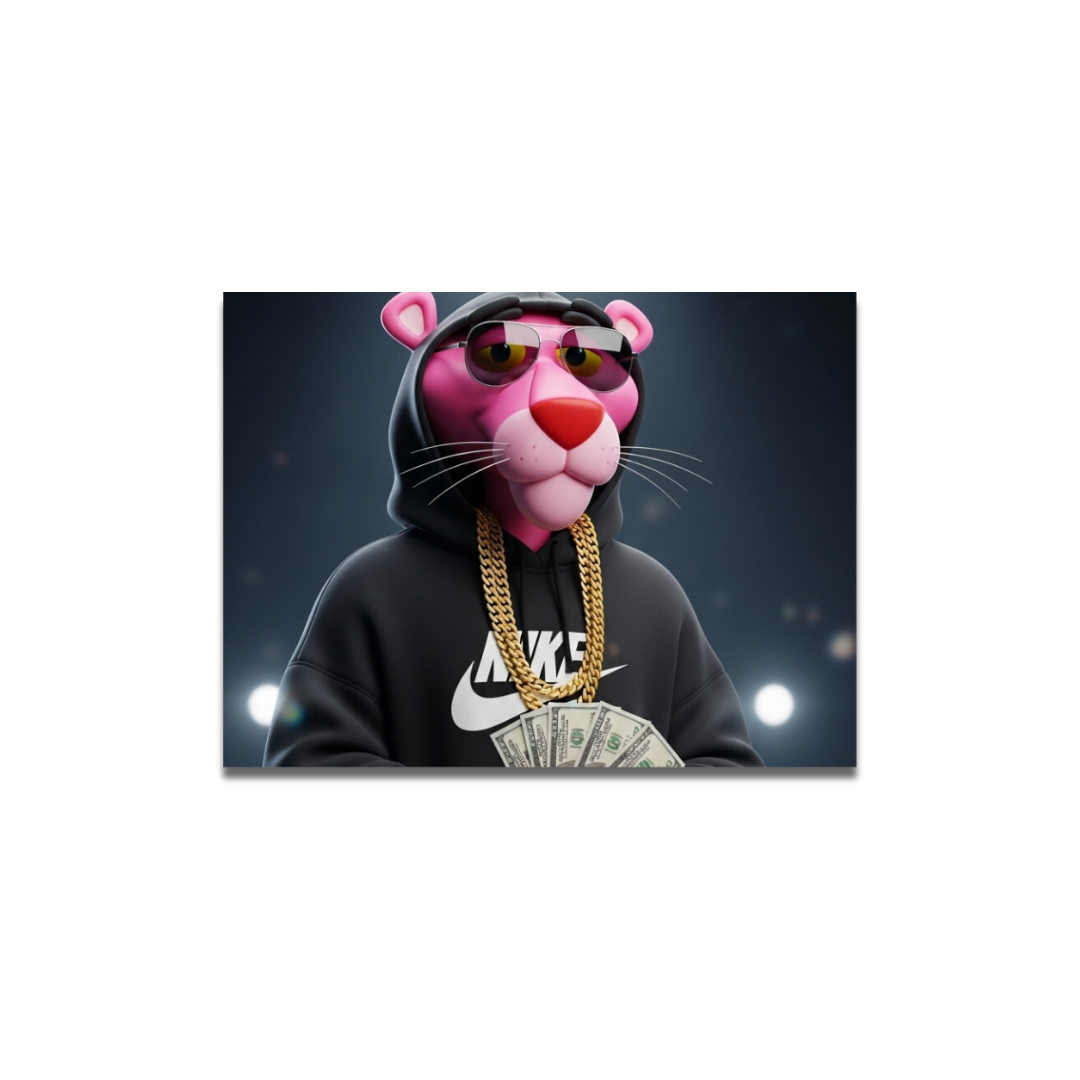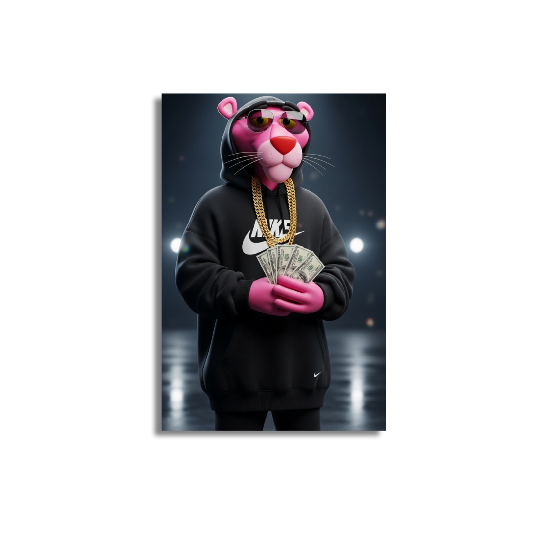 La Pantera Rosa llega con actitud premium: sudadera negra estilo street, cadena dorada y gafas oscuras, sosteniendo billetes bajo luces de estudio. Un arte que mezcla nostalgia pop con estética moderna y minimalista. Perfecto para salas gamer, estudios creativos y espacios que piden presencia con clase.