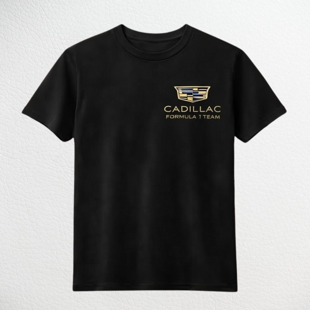 Playera negra con logotipo Cadillac F1 en acabado dorado premium.