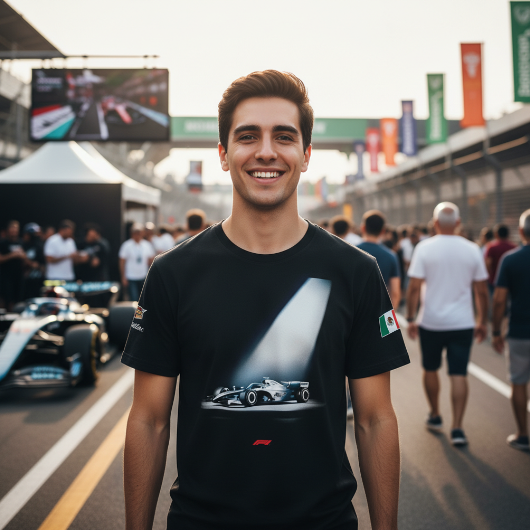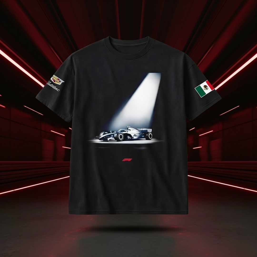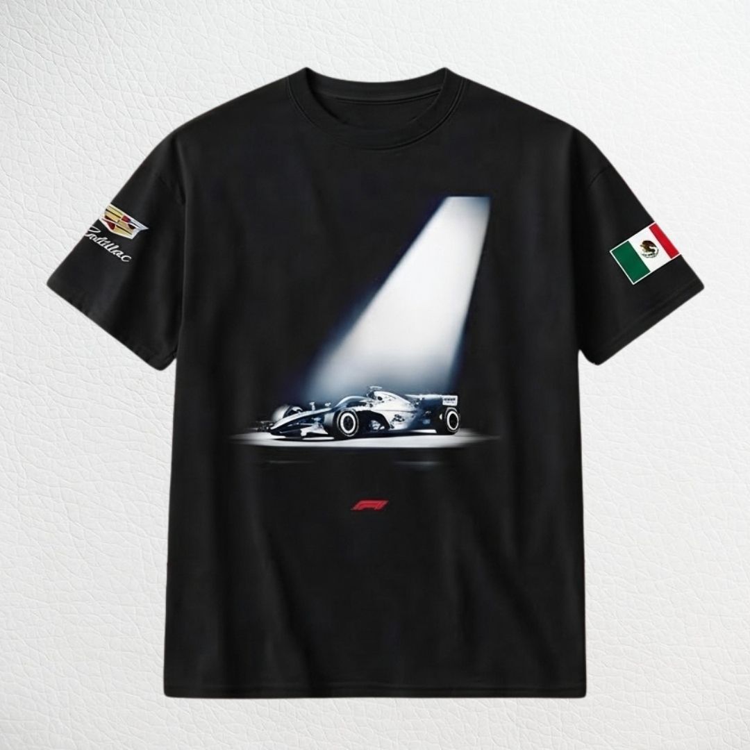 Playera negra con diseño artístico de monoplaza F1 bajo efecto spotlight.